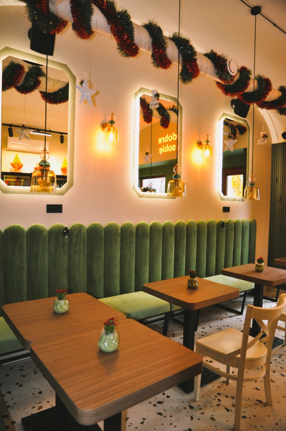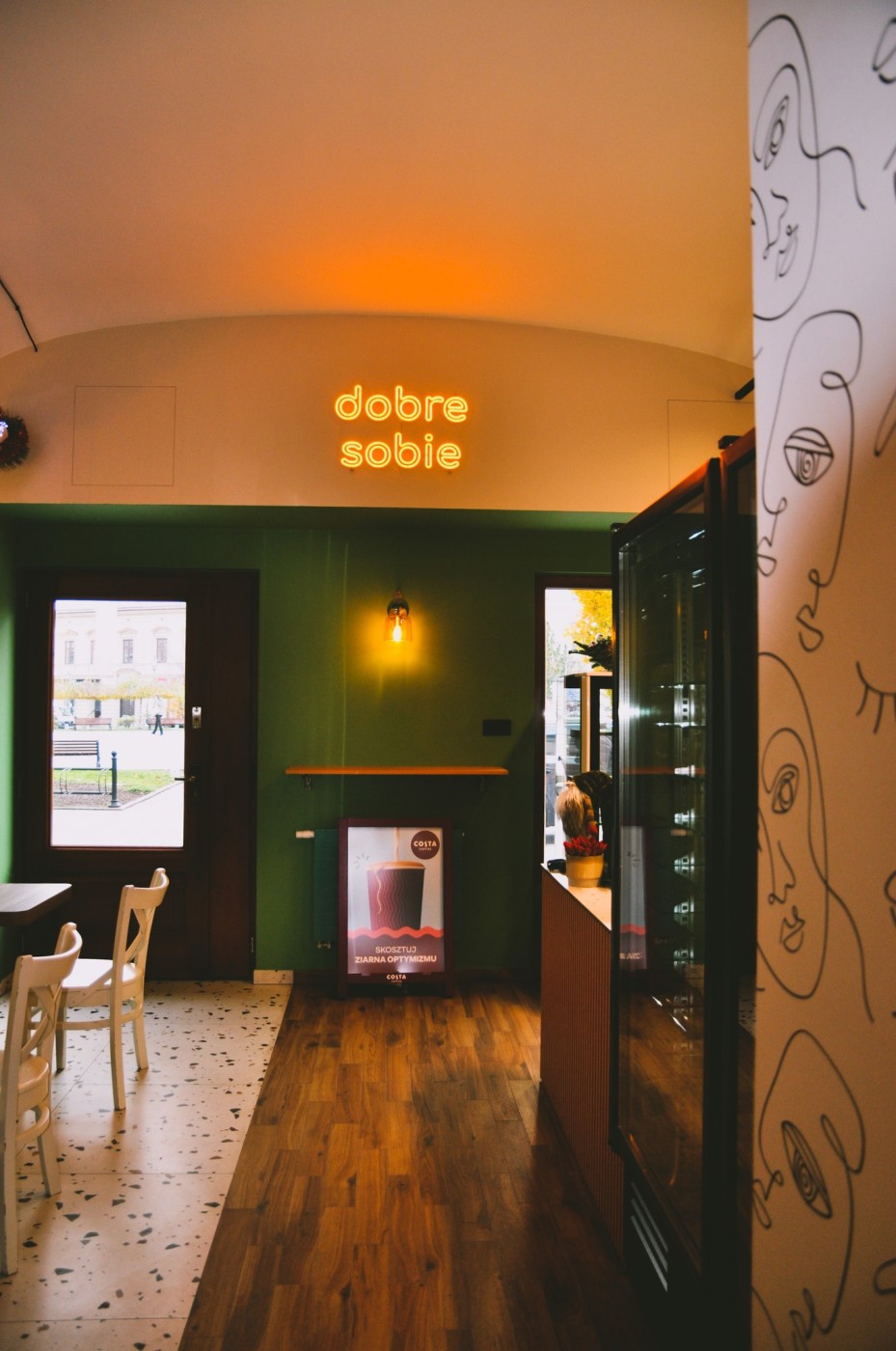 “Dobre Sobie”, oltre a caffè, cioccolato e bevande, serve dolci locali, senza tralasciare le creme di Wadowice. Il menu comprende waffle, frittelle, gnocchi e zapiekanki.