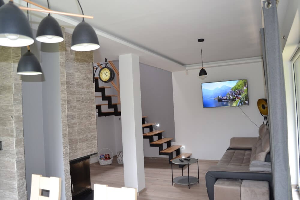 Domek jest nowocześnie i komfortowo urządzony. Murowany piętrowy domek składa się trzech pokoi w tym jeden przechodni a także łazienki z wanną na górnej kondygnacji a także kuchni, salonu wraz z jadalnią oraz łazienki z prysznicem na parterze budynku.