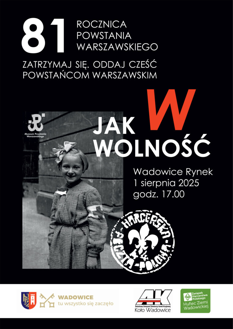 W imieniu Hufca Ziemi Wadowickiej zapraszamy do udziału w uroczystościach 81. rocznicy wybuchu Powstania Warszawskiego na wadowickim rynku w piątek 1 sierpnia 2025 o godz. 17:00.