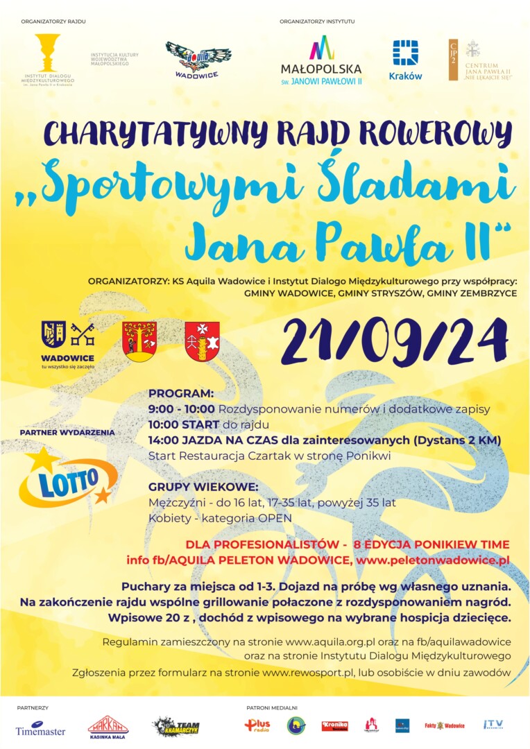 W sobotę 21 września odbędzie się charytatywny rajd rowerowy „Sportowymi Śladami Jana Pawła II” organizowany przez KS Aquila Wadowice i Instytut Dialogu Międzykulturowego przy współpracy Gminy Wadowice, gminy Stryszów i gminy Zembrzyce.