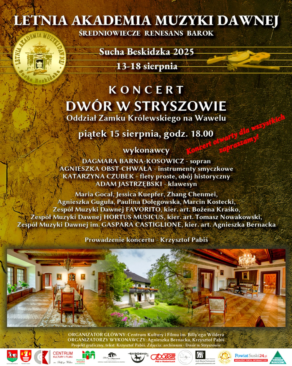 Stryszowski Dwór 15 sierpnia ożyje dźwiękami muzyki podczas koncertu w ramach Letniej Akademii Muzyki Dawnej w Suchej Beskidzkiej. To wyjątkowa okazja, by w tym pełnym historii miejscu doświadczyć niepowtarzalnego połączenia architektury, dziejów i sztuki.