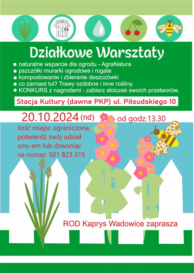 Rodzinny Ogród Działkowy Kaprys zaprasza wszystkich zainteresowanych ekologicznym ogrodnictwem czy uprawami balkonowymi na spotkanie: Działkowe Warsztaty, które odbędą się 20.10.2024 w niedziel o godz. 13.30 w sali Stacji Kultury, (dawne PKP).