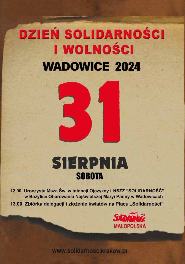 Wadowicki Oddział Regionu Małopolskiego NSZZ Solidarność jak co roku zaprasza do uczczenia pamięci tych wszystkich, którzy przed laty walczyli o odzyskanie wolności i niepodległej Polski.