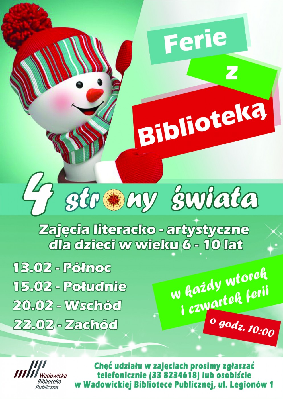 Zgodnie z coroczną tradycją Wadowicka Biblioteka Publiczna zaprasza małych czytelników w wieku od 6 do 10 lat na zajęcia literacko–artystyczne, łączące intersującą lekturę z zabawami i zajęciami plastycznymi. Tematem przewodnim tegorocznych spotkań będą „Cztery strony świata”, a więc młodzi czytelnicy poznają odległe kraje, obce kultury i ciekawe zwyczaje.