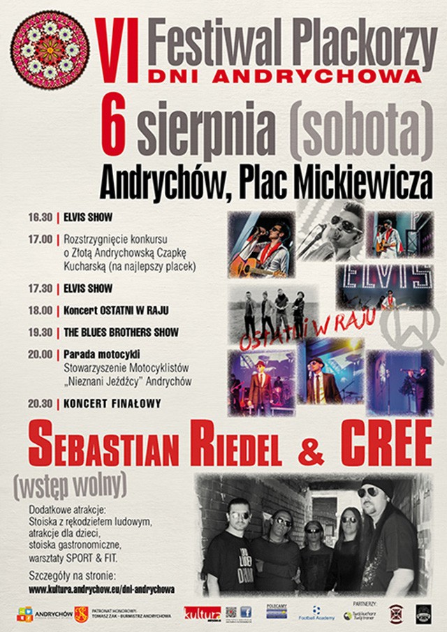 W najbliższą sobotę (6 sierpnia) na Placu Mickiewicza w Andrychowie odbędzie się cieszący się sporym powodzeniem wśród mieszkańców VI Festiwal Plockorzy. Tegoroczne Dni Andrychowa rozpoczną się o godz. 16:30. Na scenie zagrają takie zespoły jak: Elvis Show, Ostatni w Raju, The Blues Brothers Show a także zespół Sebastiana Riedla & Cree.