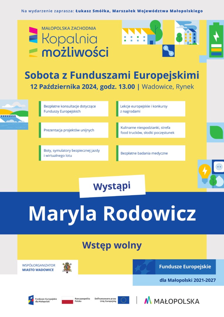 Już w najbliższą sobotę, 12 października, zapraszamy do Wadowic na pierwszy z cyklu funduszowy piknik rodzinny „Małopolska Zachodnia – kopalnia możliwości”. Znajdziesz nas na wadowickim rynku od 13.00 do 19.00. Przyjdź i dowiedz się, jak skorzystać z możliwości, jakie dają Fundusze Europejskie w Małopolsce.