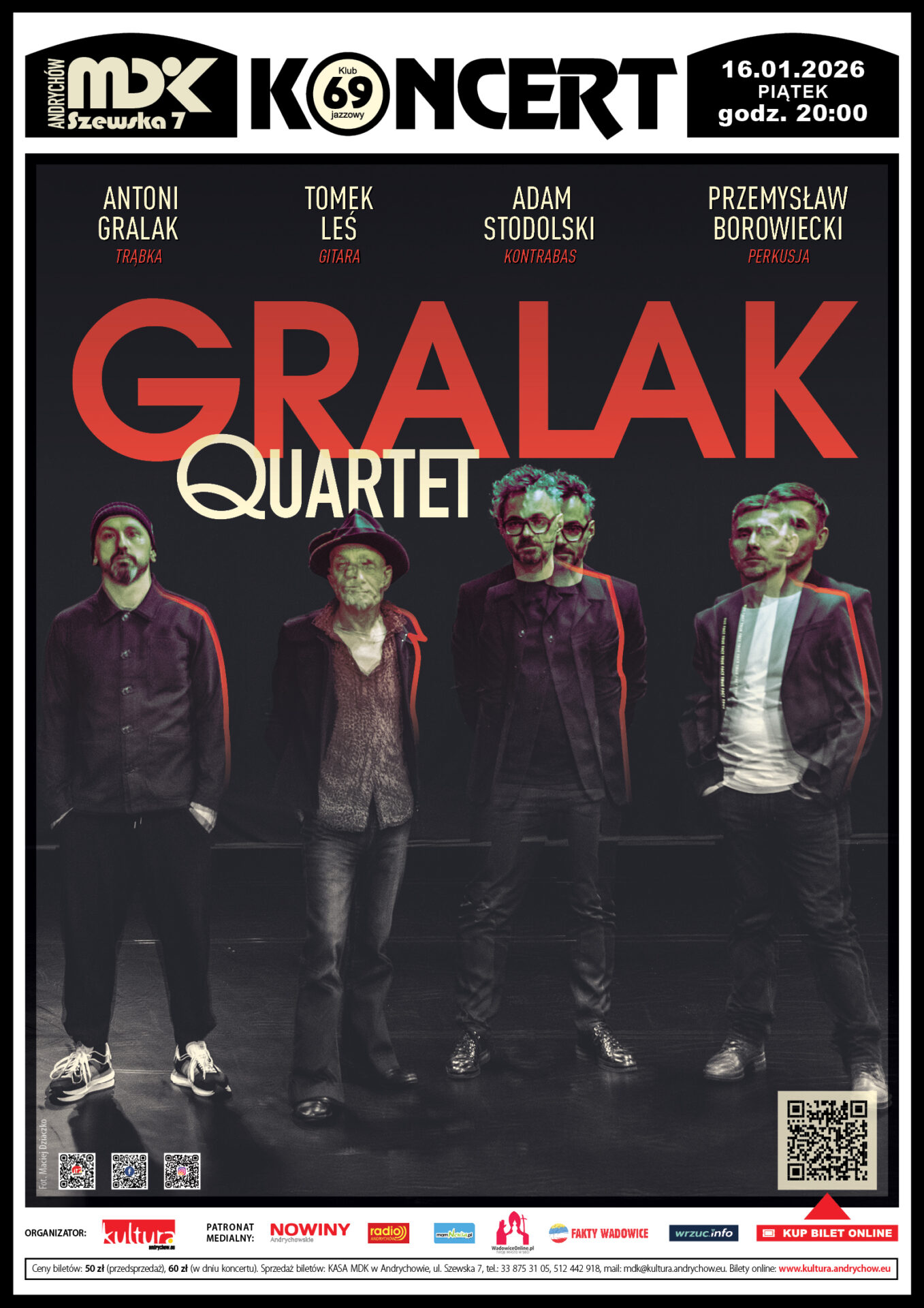 Andrychowski Klub jazzowy 69 prezentuje koncert zespołu GRALAK QUARTET w składzie: Antoni Gralak – trąbka, Tomek Leś – gitara, Adam Stodolski – kontrabas, Przemysław Borowiecki – perkusja. Koncert odbędzie się 16 stycznia 2026 roku (piątek) o godz. 20.00 w Miejskim Domu Kultury w Andrychowie. Bilety dostępne w MDK oraz online na stronie kultura.andrychow.eu