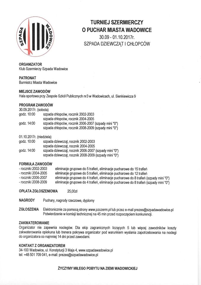 KS Szpada Wadowice rozpoczął przygotowania do II Turnieju o puchar Miasta Wadowice, który będzie rozegrany w dniach 30.09.2017-01.10.2017 r.