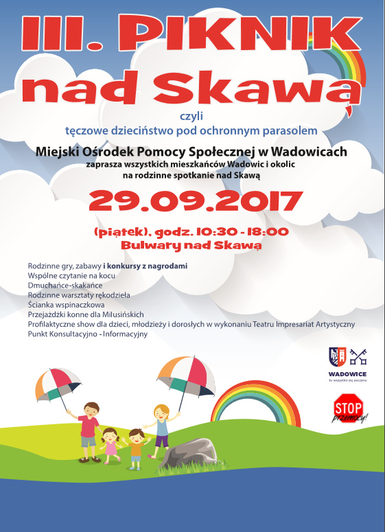 Miejski Ośrodek Pomocy Społecznej w Wadowicach serdecznie zaprasza całe rodziny w piątek 29 września na III Piknik nad Skawą, czyli tęczowe dzieciństwo pod ochronnym parasolem!