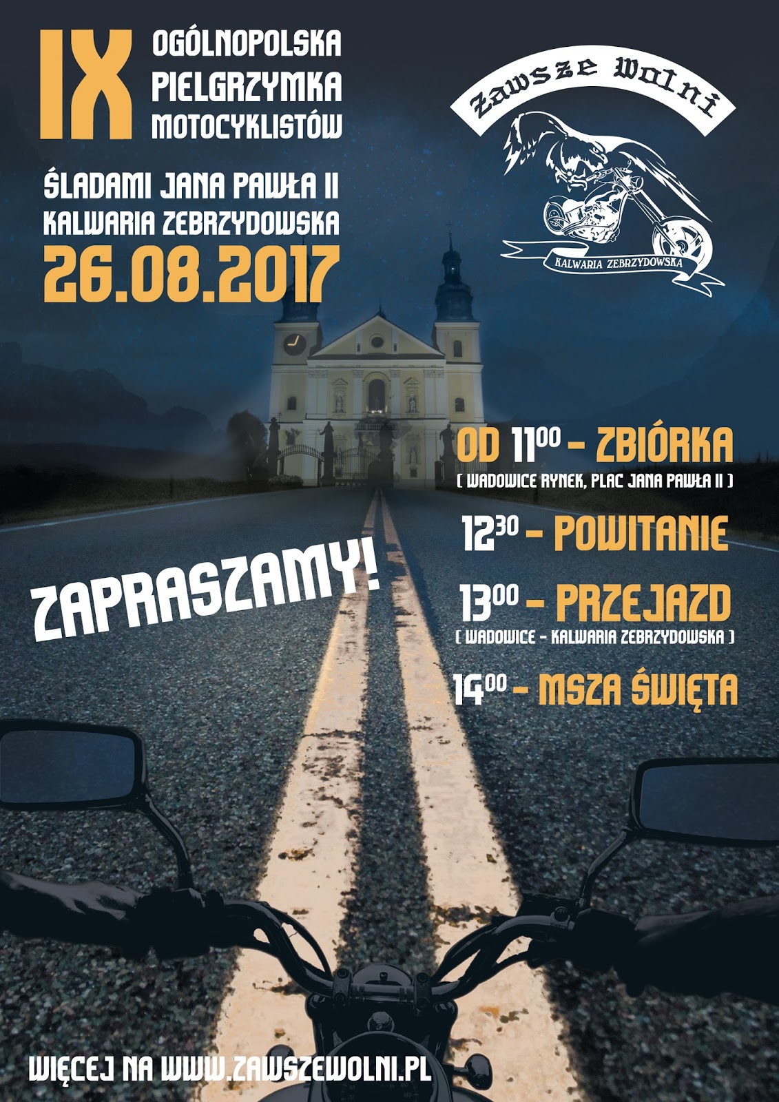 26 sierpnia (sobota) wyruszy IX Ogólnopolska Pielgrzymka Motocyklistów śladami Jana Pawła II z Wadowic do Kalwarii Zebrzydowskiej. Motocykliści jak co roku będą dziękować w Sanktuarium Kalwaryjskim za opiekę św. Krzysztofa i prosić o bezpieczną jazdę na przyszłość. Organizatorem pielgrzymki są miłośnicy jednośladów z Kalwarii Zebrzydowskiej skupieni w grupie "Zawsze Wolni".