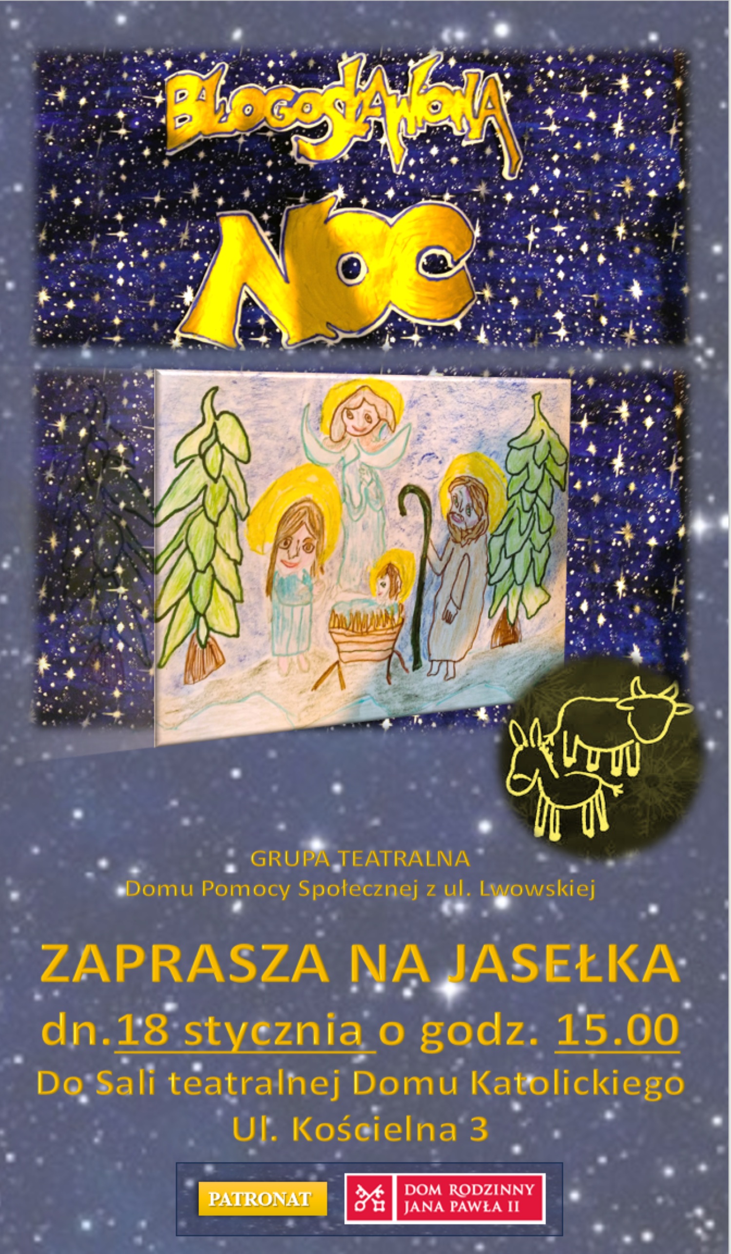W niedzielę 18 stycznia 2026 r. o godz. 15.00 w sali teatralnej Domu Katolickiego w Wadowicach odbędą się jasełka „Błogosławiona Noc”, przygotowane przez mieszkanki Domu Pomocy Społecznej Sióstr Nazaretanek w Wadowicach. Spektakl objęty został patronatem Muzeum Dom Rodzinny Ojca Świętego Jana Pawła II w Wadowicach.