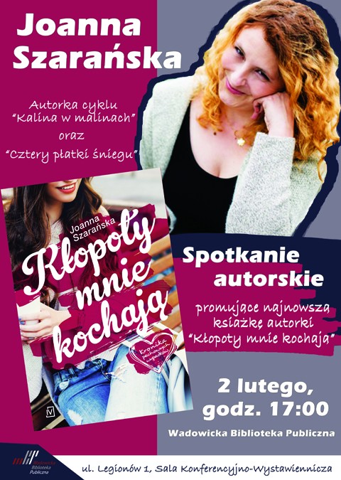 Teraz Pani Joanna spotka się z czytelnikami Wadowickiej Biblioteki Publicznej, aby promować swoją najnowszą powieść„Kłopoty mnie kochają”. Jest to pierwszy tom nowego cyklu, którego akcja rozgrywa się w Wadowicach! Książka stanowi połączenie lekkiego kryminału z komedią omyłek, dzięki czemu gwarantuje świetną zabawę i chwilę rozluźnienia. Bohaterką powieści jest niespełniona dziennikarka - Zojka Tuszyńska, która powraca do rodzinnej miejscowości, aby zaopiekować się ukochaną babcią. Wrodzony talent do pakowania się w tarapaty sprawia, że dziewczyna szybko wplątuje się w kryminalną aferę. Zapowiada się zatem świetna zabawa z przymrużeniem oka.