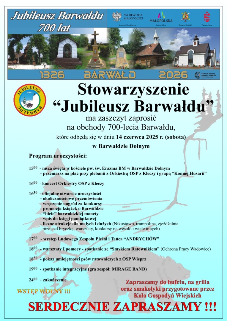 Stowarzyszenie „Jubileusz Barwałdu” zaprasza na uroczyste obchody 700-lecia miejscowości Barwałd. Wydarzenie odbędzie się 14 czerwca 2025 roku w Barwałdzie Dolnym i będzie pełne atrakcji dla całych rodzin.