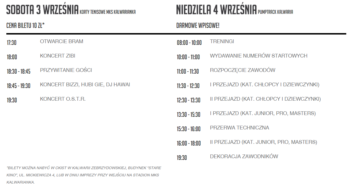 Kalwaria Summer Fest to dwudniowa impreza łącząca w sobie dwie pasje: rowery i dobrą muzykę. Pierwszego dnia organizatorzy od godziny 17.30 zapraszają na koncertowy wieczór wystąpią Bizzi, Hub Gie i Dj Hawai, a gwiazdą wieczoru będzie O.S.T.R! Natomiast dzień drugi festiwalu (4 września) to czas na zawody Pumptrack. Start już od 8.00 rano! Więcej informacji znajdą Państwo na stronie Kalwaria Summer Fest.