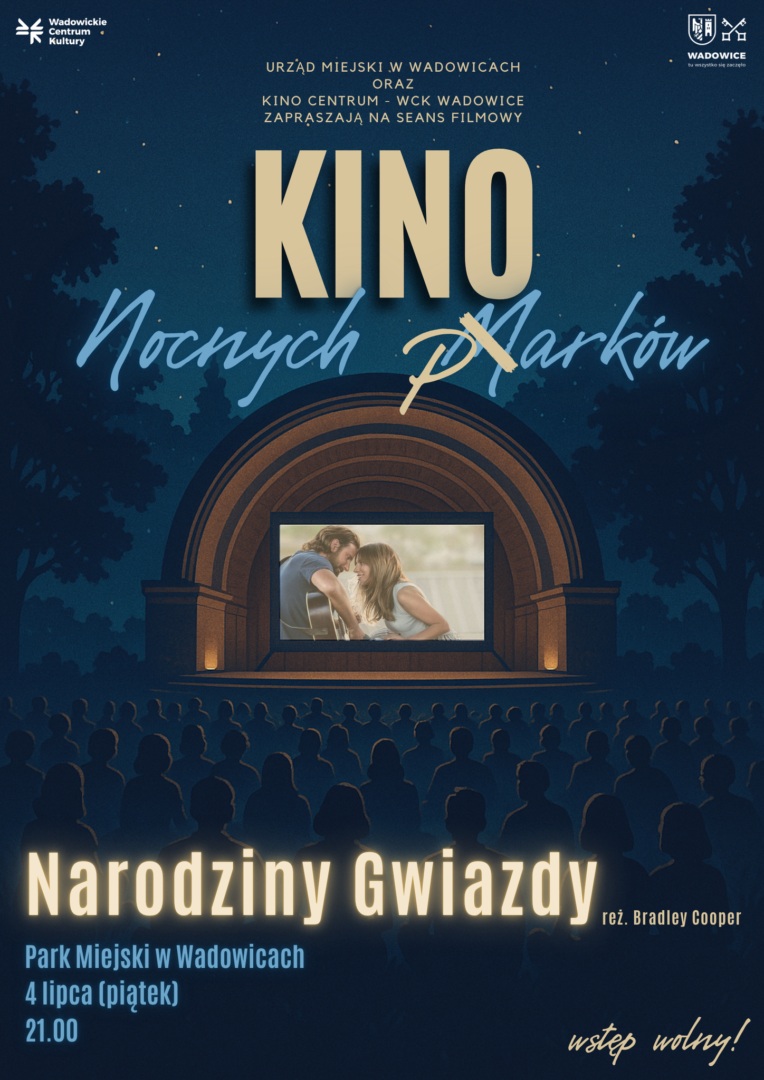 Zapraszamy na magiczny seans pod chmurką w ramach cyklu Kino Nocnych Marków! Już w piątek 4 lipca spotykamy się w Parku Miejskim, by wspólnie obejrzeć „Narodziny Gwiazdy” – wzruszający film z fenomenalną Lady Gagą i Bradleyem Cooperem w rolach głównych. Będzie romantycznie, muzycznie i filmowo – idealna okazja, by spędzić wieczór z rodziną, przyjaciółmi lub… drugą połówką. Przyjdź, rozsiądź się wygodnie na kocu i daj się porwać historii, która podbiła serca widzów na całym świecie!
