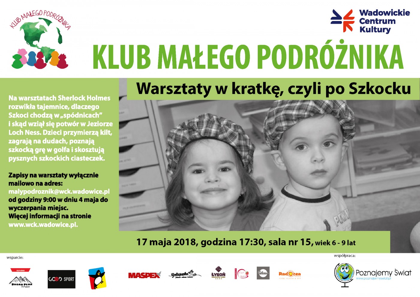 W ramach cyklu Klub Małego Podróżnika w dniu 15 maja 2018r. o godz. 17:30 rozpocznie się spotkanie pt.„Warsztaty w kratkę, czyli po Szkocku”. Odbedzie się ono w budynku Wadowickiego Centrum Kultury (ul. Teatralna 1) w sali nr 15 dla dzieci w wieku 6-9 lat. Na warsztatach Sherlock Holmes rozwikła tajemnice, dlaczego Szkoci chodzą w „spódnicach” i skąd wziął się potwór w Jeziorze Loch Ness. Dzieci przymierzą kilt, zagrają na dudach, poznają szkocką grę w golfa i skosztują pysznych szkockich ciasteczek.