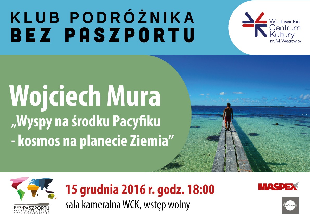 Po raz ostatni w tym roku (15 grudnia) wadowicki Klub Podróżnika zaprasza nas na spotkanie. Tym razem "raj na ziemi" czyli o wyspach na środku Pacyfiku opowie nam Wojtek Mura.