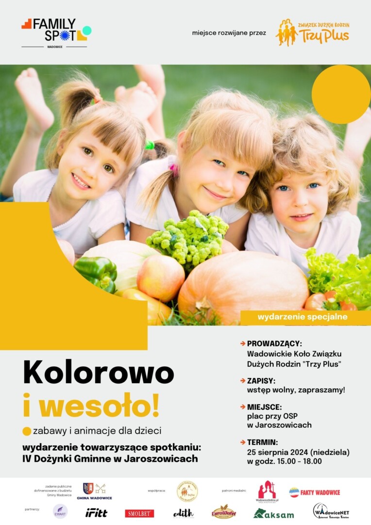 Serdecznie zapraszamy na spotkanie #FamilySpotWadowice pt. „Kolorowo i wesoło!”, które jest wydarzeniem towarzyszącym imprezie: „IV Dożynki Gminne w Jaroszowicach”.