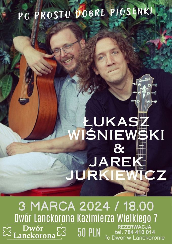 Dwór w Lanckorownie zaprasza 3 marca o godz.18.00 na harmonijkowo-gitarowe super duo Łukasza Wiśniewskiego i Jarka Jurkiewicza z „po prostu dobrymi piosenkami”.
