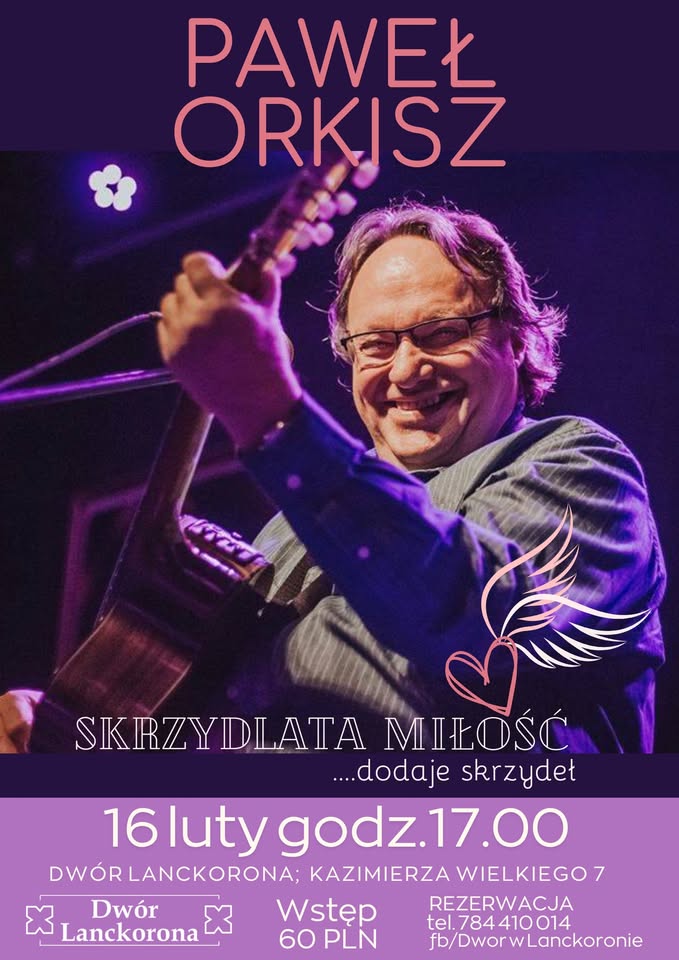 Krakowski poeta i bard, autor niezwykłych ballad, pięknych pieśni i płyt z muzyką leczącą duszę, po raz pierwszy odwiedzi Lanckoronę. W mieście Aniołów, skrzydlatych istot, opowie Wam "o miłości, która unosi, podnosi, uskrzydla, nadaje sens, przywraca uśmiech, otwiera oczy na każdy szczegół dnia, pachnie i zachwyca.