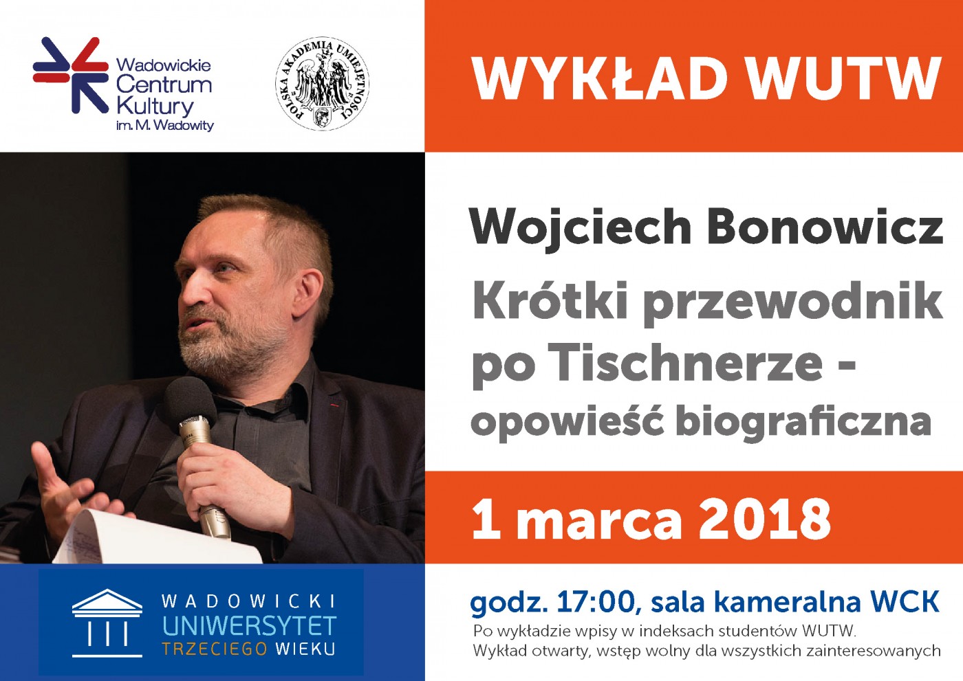 Wadowicki Uniwersytet Trzeciego Wieku zaprasza 1 marca br na godz. 17:00 do sali kamerlanej w Wadwoickim Centrum Kultury (ul. Teatralna1) na wykład otwarty pt. "Krótki przewodnik po Tischnerze - opowieść biograficzna".