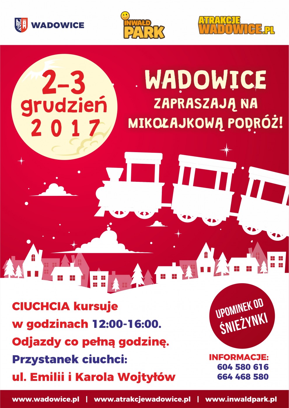 Urząd Miejski w Wadowicach we współpracy z Atrakcjewadowice.pl przygotował dla wszystkich mieszkańców wspaniałą atrakcję! W dniach 2-3 grudnia (sobota - niedziela) kursować będzie bezpłatna ciuchcia świąteczna, która zabierze każdego chętnego w magiczną podróż po Wadowicach. Ciuchcia będzie kursować w godzinach 12:00 - 16:00, a odjeżdżać co pełną godzinę z przystanku na ul. Emilii i Karola Wojtyłów. Dla dzieci podróżujących w tych dniach ciuchcią przygotowaliśmy słodkie upominki od śnieżynki! Więcej informacji dostępnych na stronie www.atrakcjewadowice.pl oraz telefonicznie pod numerem: 604-580-616, 664-468-580
