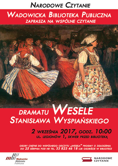 Wadowicka Biblioteka Publiczna aktywnie włącza się w ten projekt, organizując wspólne czytanie tej fascynującej lektury. W związku z tym, zapraszamy wszystkich chętnych do aktywnego uczestnictwa w ogólnopolskiej akcji i zgłaszania chęci udziału we wspólnym czytaniu. Czas spędzony z bohaterami „Wesela”, będzie okazją do inspirującej refleksji i przypomnienia treści ważnych dla naszej historii i kultury. Będzie to także okazja do odpoczynku w miłej, literackiej atmosferze i przy pysznym poczęstunku (przygotowanym przez Koło Gospodyń Wiejskich z Wysokiej)