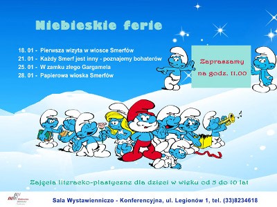 W tym roku przewodnikami po krainie zabawy będą Smerfy - niebiescy bohaterowie jednej z najpopularniejszych kreskówek wszechczasów. W każdy poniedziałek i czwartek o godzinie 11.00 dzieci wraz z opiekunami będą uczestniczyć we wznoszeniu smerfnej wioski oraz będą zgłębiać smerfne tajemnice. Oprócz „obowiązkowych” zajęć manualnych, organizatorzy proponują również zabawy logiczne, łamigłówki, projekcje filmów, konkursy. Nie zabraknie też spotkań z czarnoksiężnikiem Gargamelem oraz jego wiernym druhem Klakierem. Cykl zajęć zakończy wspólne konstruowanie smerfnych domków oraz prezentacją społeczności Smerfów. Biblioteka serdecznie zaprasza do wspólnej zabawy!