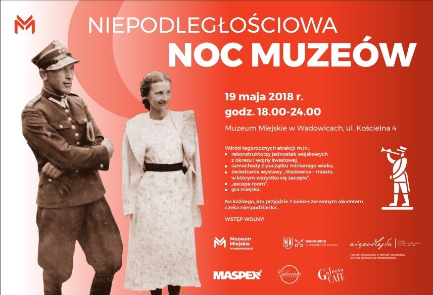 Wreszcie Wadowice. Wystawę w Muzeum Dom Rodzinny Ojca Świętego Jana Pawła II można będzie zwiedzać wystawę stałą według kolejności przybycia zaczynając od godz. 19-tej, ostatnie wejście o 22.45. W „Czytelni Mieszczańskiej” Towarzystwo Miłośników Ziemi Wadowickiej zaprezentuje wystawę o drze Józefie Sołtysiku – lekarzu pokoleń. Muzeum Miejskie w Wadowicach, które od 2011 roku koordynuje Noc Muzeów ziemi wadowickiej, w tym roku koncentruje się na 100 rocznicy odzyskania przez Polskę Niepodległości. W klimat wydarzeń sprzed lat wprowadzą zwiedzających rekonstruktorzy jednostek wojskowych, które walczyły w czasie I wojny światowej, prezentując rynsztunek i uzbrojenie z epoki. Dopełnieniem tego będą stojące na ul. Kościelnej samochody z początku minionego wieku. Z okazji akcji „100 zdjęć na 100 lecie Niepodległej” miłośnicy fotografii będą mogli skorzystać z fotobudki i zrobić sobie zdjęcie w monidle. Z kolei zwiedzaniu stałej wystawy „Wadowice – miasto, w którym wszystko się zaczęło” towarzyszyć będzie gra miejska, „escape room” osadzone w realiach 1918 r. Na każdego, kto przyjdzie z biało-czerwonym akcentem będzie czekać niespodzianka...