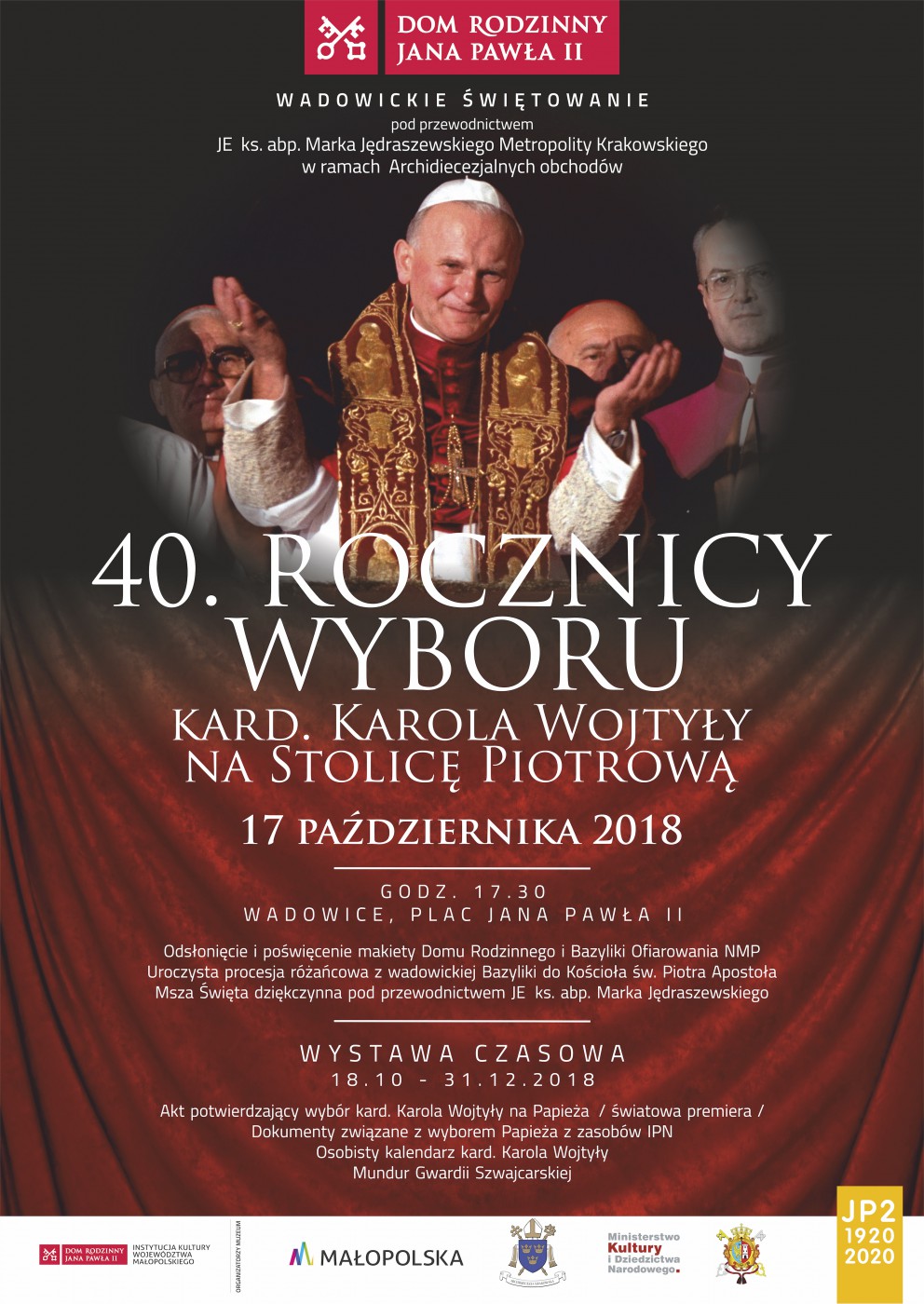 17 października br., Muzeum Dom Rodzinny Ojca Świętego Jana Pawła II w Wadowicach zaprasza na świętowanie 40. rocznicy wyboru kard. Karola Wojtyły na Następcę św. Piotra, które odbędzie się pod przewodnictwem JE abpa. Marka Jędraszewskiego, w ramach archidiecezjalnych obchodów rocznicowych.