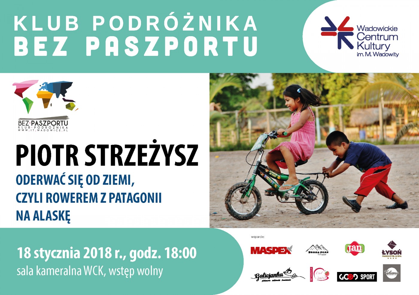 Już 18 stycznia (czwartek) o godz. 18:00 w sali kameralnej Wadowickiego Centrum Kultury (ul. Teatralna 1) rozpocznie się spotkanie z Piotrem Strzeżyszem pt. „Oderwać się od ziemi, czyli rowerem z Patagonii na Alaskę”.