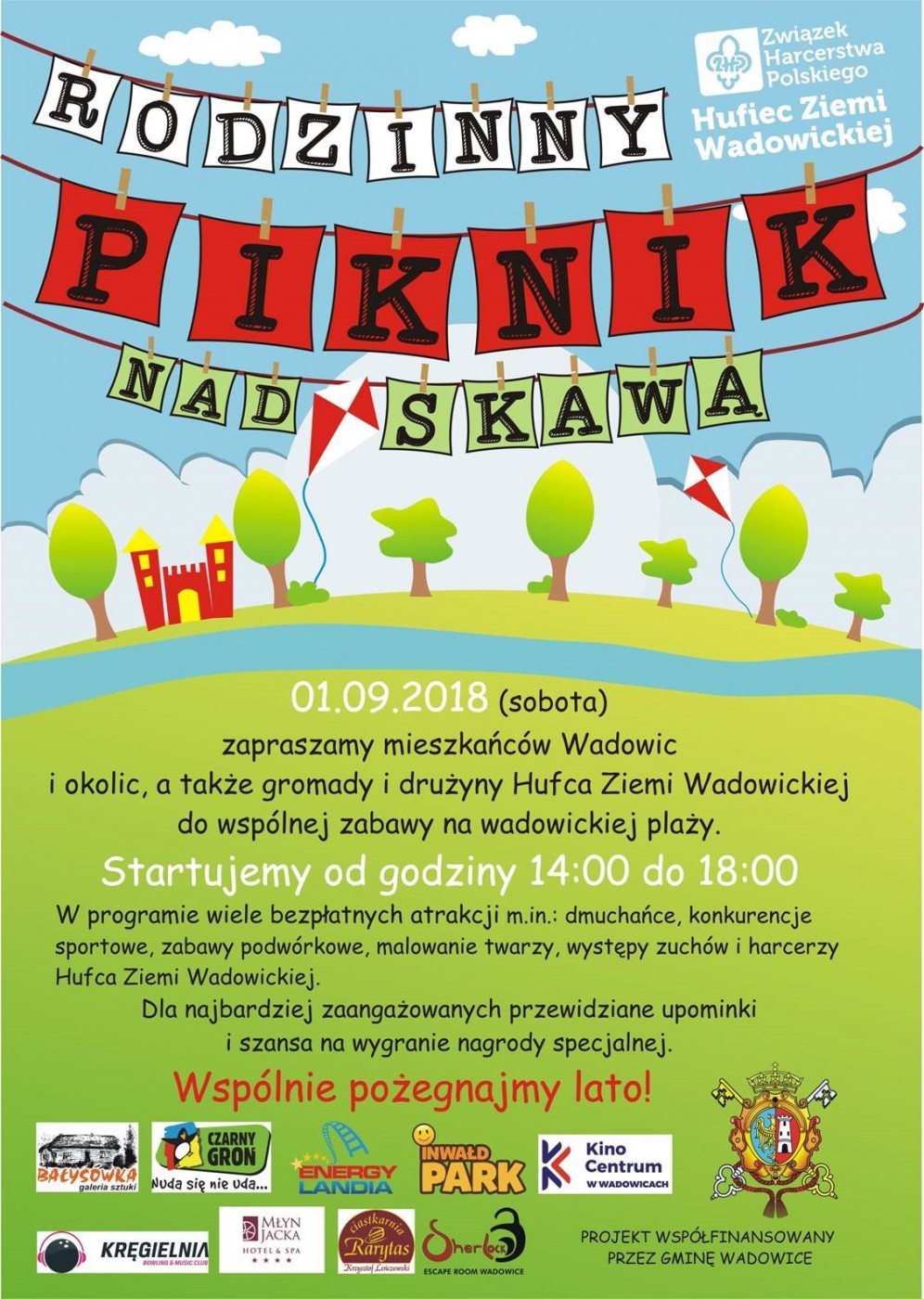 W najbliższą sobotę tj. 1 września 2018 r. Hufiec Ziemi Wadowickiej zaprasza na Piknik Rodzinny nad Skawą! Startujemy o godz. 14:00. Tak jak w ubiegłym roku, pożegnamy wspólnie wakacje w harcerskim i rodzinnym gronie. W programie wiele bezpłatnych atrakcji m.in. dmuchańce, konkurencje sportowe, zabawy podwórkowe, malowanie twarzy, występy zuchów i harcerzy Hufca Ziemi Wadowickiej.