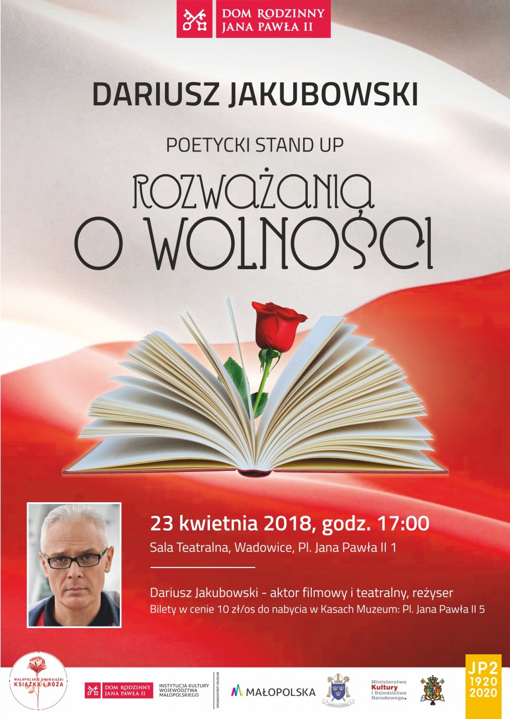 Muzeum Dom Rodzinny Ojca Świętego Jana Pawła II w Wadowicach serdecznie zaprasza na poetyckie rozważania o wolności z aktorem teatralnym i filmowym – Dariuszem Jakubowskim, które odbędzie się 23 kwietnia 2018 r. o godz. 17.00 w sali teatralnej przy pl. Jana Pawła II 1. Poetycki stand up organizowany jest w ramach XVII edycji Małopolskich Dni Książki. „Książka i Róża”. Dariusz Jakubowski zaprezentuje ulubioną poezję Jana Pawła II oraz fragmenty wypowiedzi papieża na temat roli literatury i kultury w kształtowaniu wolności. Rozważania będą okazją do wspólnych poszukiwań, co dziś oznacza być wolnym i czy istnieje potrzeba odwoływania się do literatury, by wolność chronić.