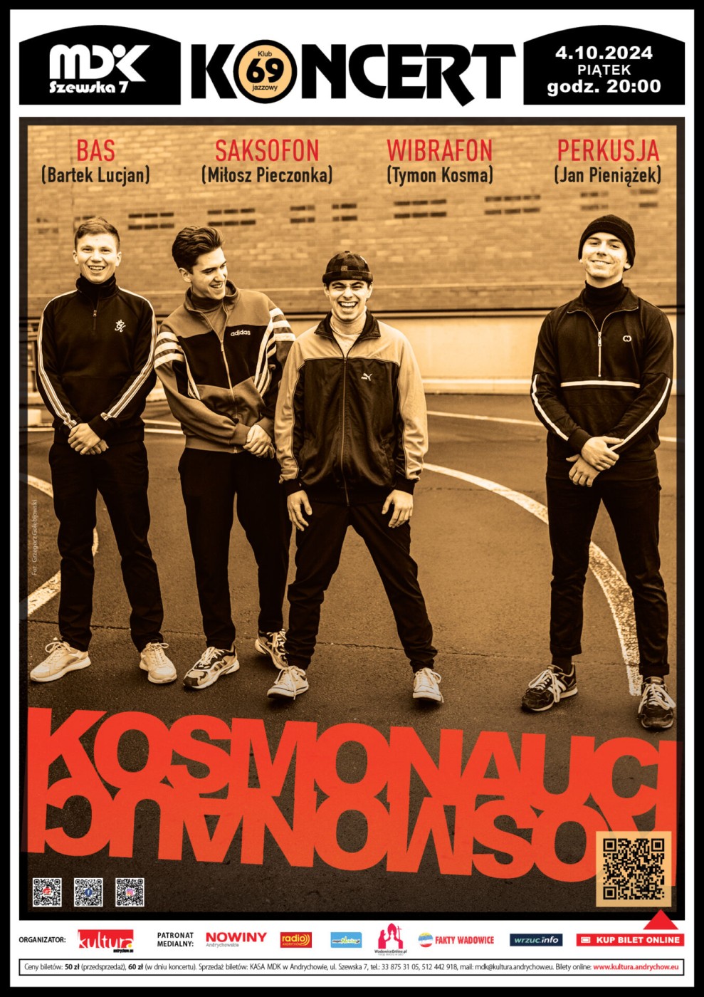 Klub jazzowy 69 prezentuje koncert zespołu KOSMONAUCI w składzie: Miłosz Pieczonka – saksofon, Tymon Kosma – wibrafon, Bartek Lucjan – bas, Jan Pieniążek – perkusja. Koncert odbędzie się 4 października 2024 r. w Miejskim Domu Kultury w Andrychowie, start: godz. 20:00.