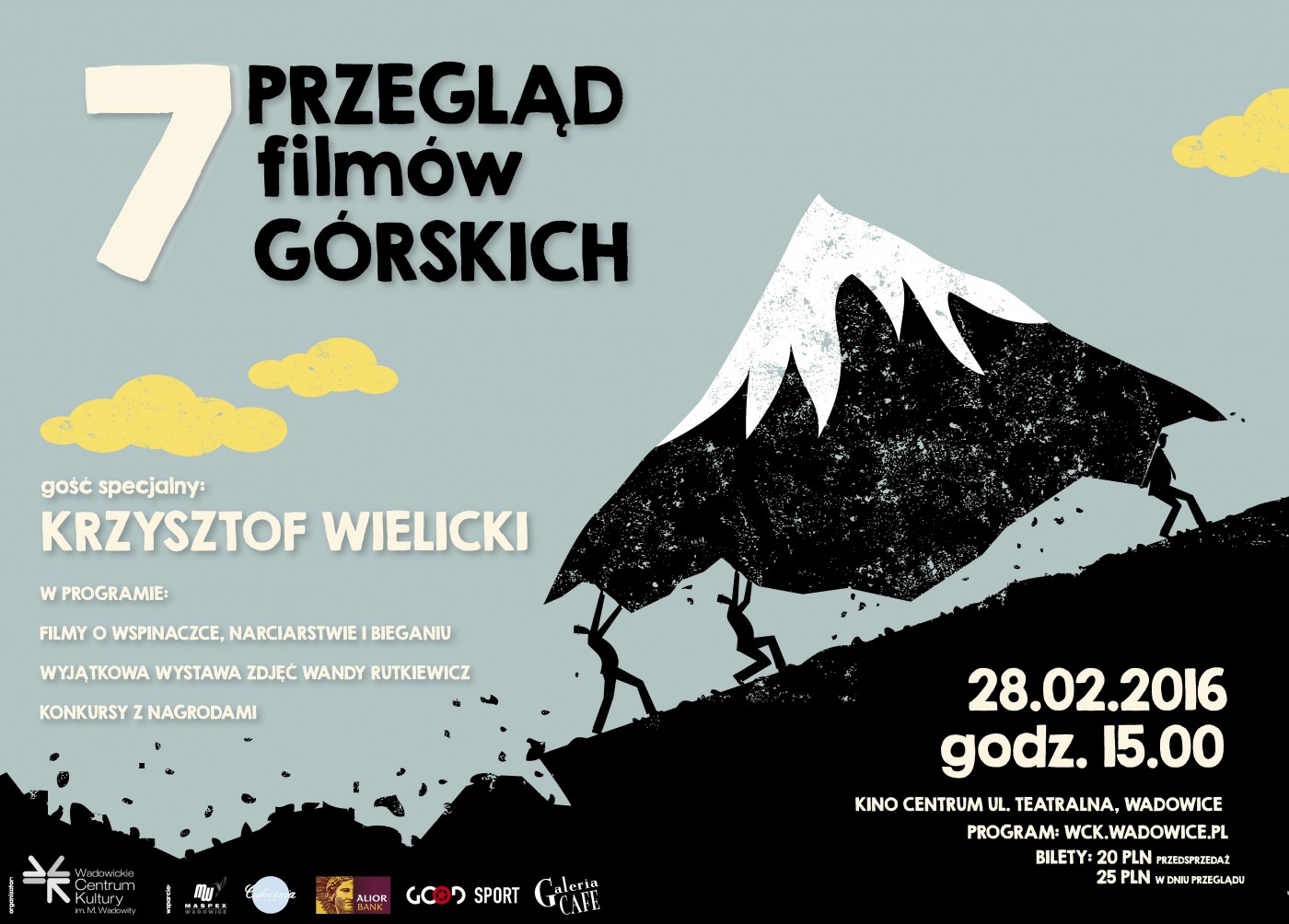 28 lutego br. zapraszamy wszystkich miłośników gór, wspinaczki i białego szaleństwa na Przegląd Filmów Górskich. Spotkanie odbędzie się w Wadowickim Centrum Kultury, ul. Teatralna 1 w sali teatralno-kinowej.