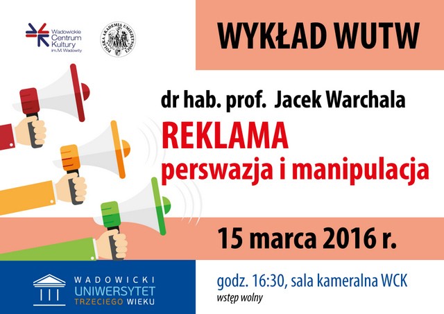 Tematem marcowego wykładu studentów Wadowickiego Uniwersytetu Trzeciego Wieku będzie reklama – jej cele, funkcje i oddziaływanie na odbiorcę. Uczestnicy wykładu dowiedzą się jakimi technikami posługują się producenci by zareklamować, a przede wszystkim sprzedać swój produkt. Jakiej poddawani jesteśmy manipulacji, żeby kupić określony produkt. Wykład poprowadzi prof. dr hab. Jacek Warchala – językoznawca, praktyk w dziedzinie reklamy i public relations, na co dzień pracujący na Uniwersytecie Śląskim w Katowicach.