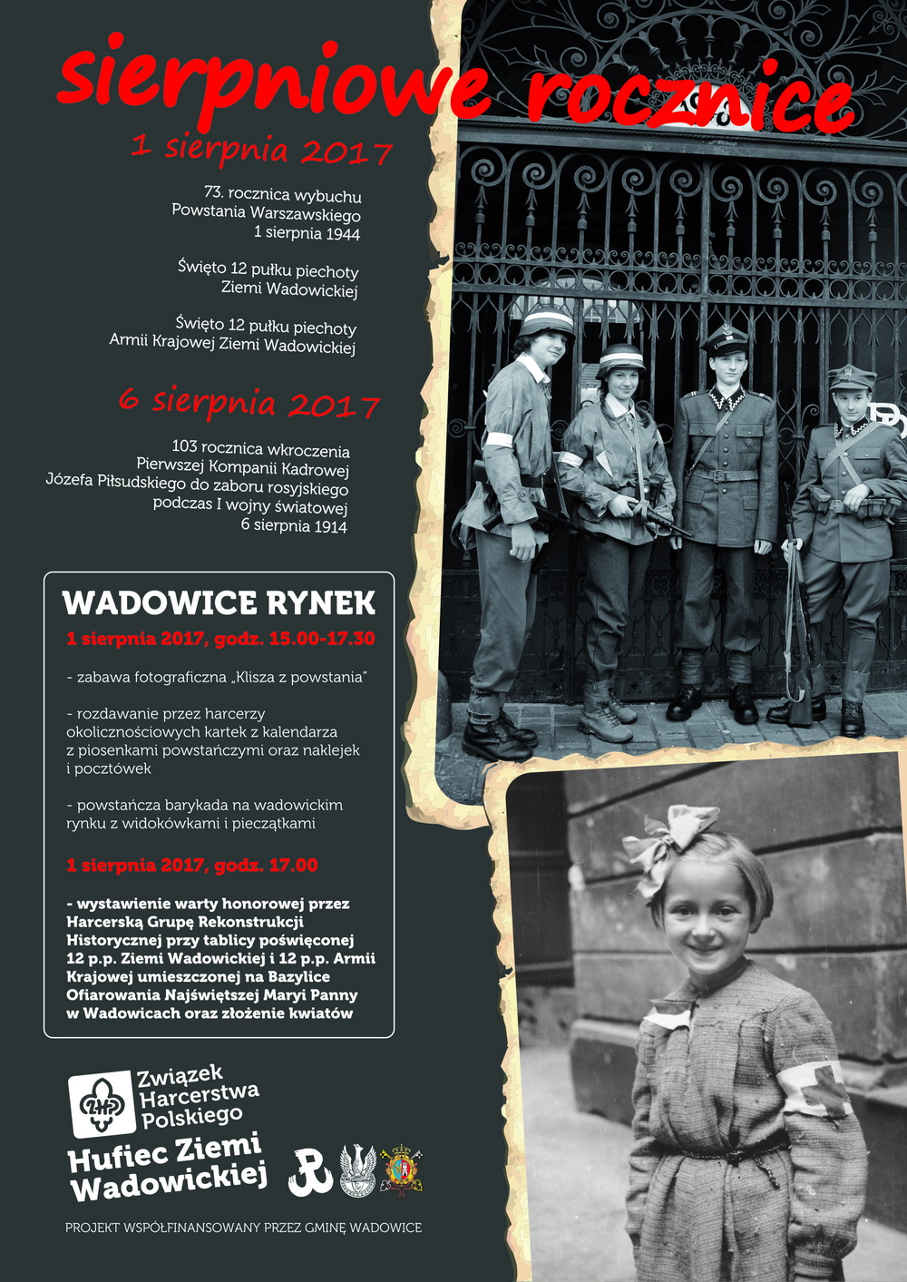 We wtorek 1 sierpnia 2017 roku między godz. 15.00 a 17.30 z okazji 73 rocznicy wybuchu Powstania Warszawskiego, święta 12 pułku piechoty Ziemi Wadowickiej oraz święta 12 pułku piechoty Armii Krajowej Ziemi Wadowickiej Komenda Hufca Ziemi Wadowickiej ZHP i Urząd Miejski w Wadowicach zapraszają bardzo serdecznie wszystkich mieszkańców Wadowic do akcji plenerowej, której celem będzie przypomnienie o udziale w Powstaniu Warszawskim dzieci i młodzieży – harcerzy Szarych Szeregów oraz zainteresowanie młodych Polaków historią naszego kraju oraz przekazanie młodemu pokoleniu etosu i idei czynu niepodległościowego Armii Krajowej, Szarych Szeregów i innych organizacji niepodległościowych.
