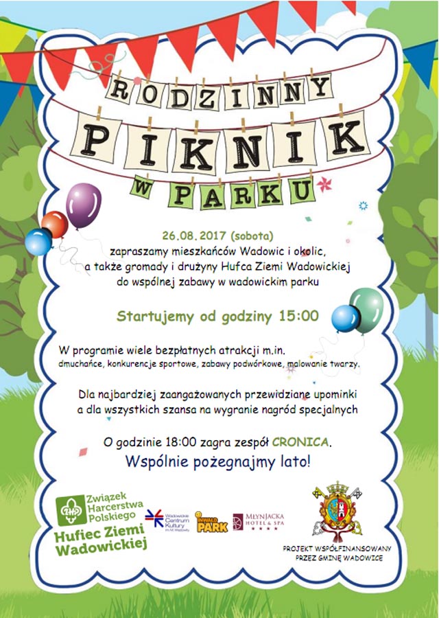 Już w najbliższą sobotę 26 sierpnia harcerze ZHP z Hufca Ziemi Wadowickiej zapraszają mieszkańców Wadowic i okolic na Rodzinny Piknik w Parku Miejskim! W programie mnóstwo bezpłatnych atrakcji: m.in. dmuchańce, konkurencje sportowe, zabawy podwórkowe, malowanie twarzy, upominki oraz szansa na wygranie nagród specjalnych. Start pikniku o godzinie 15.00, a o godzinie 18.00 zagra zespół CRONICA.