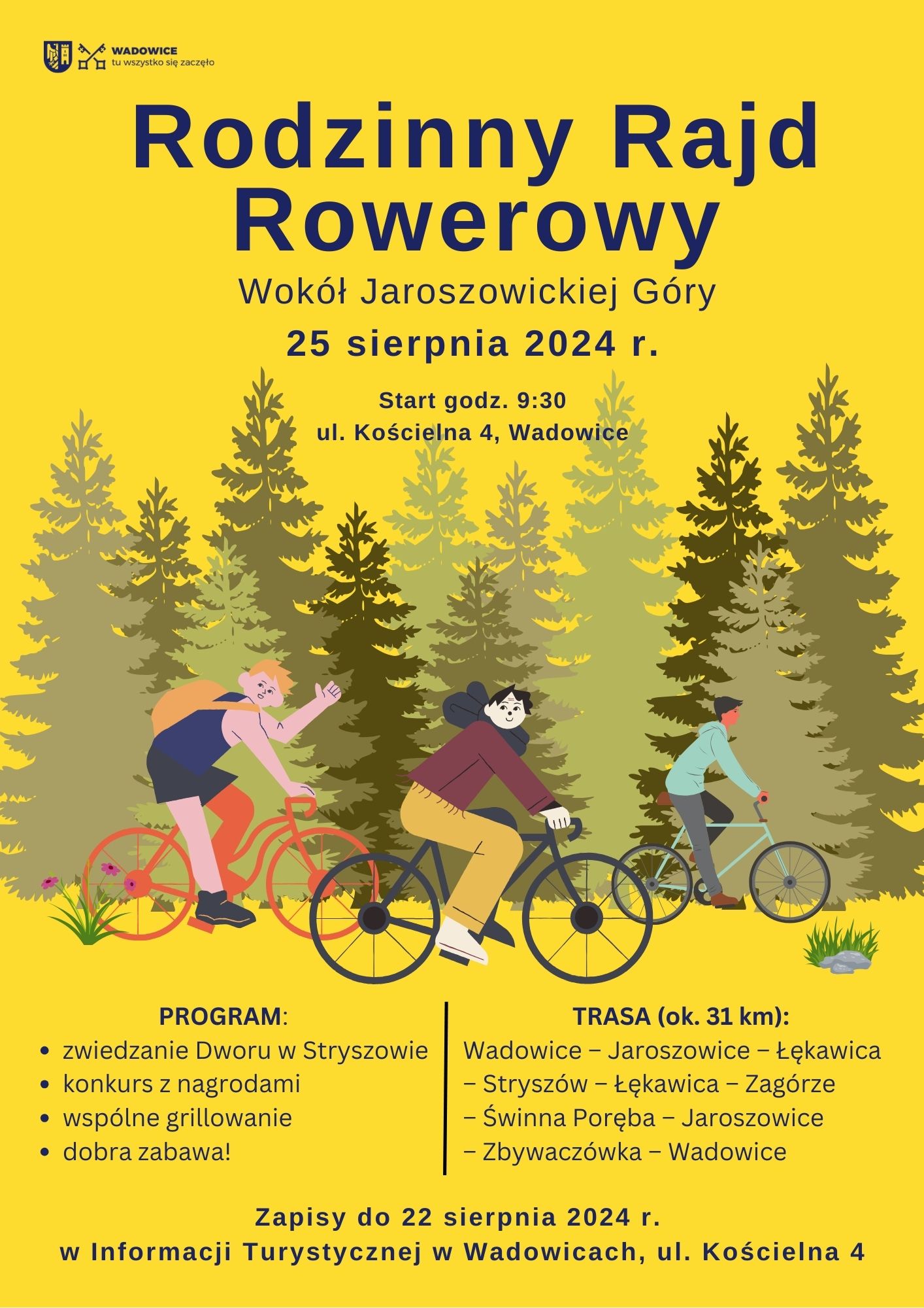 W tym roku zapraszamy na rajd wokół Jaroszowickiej Gróry. Trasa jest urozmaicona i będzie przebiegać częściowo przez leśne szlaki o zróżnicowanej nawierzchni i z miejscowymi przewyższeniami. Wyruszamy z Wadowic i odwiedzimy następujące miejscowości: Jaroszowice, Łękawica, Stryszów (zwiedzanie Dworu w Stryszowie), ponownie Łękawica, Zagórze, Jaroszowice-Zbywaczówka (poczęstunek), po czym wrócimy na wadowicki rynek. Do przejechania mamy 31 km. Łączny czas przejazdu to ok. 6 godzin. Rajd zakończy się ok. godz. 15:30.
