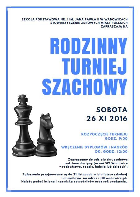 Szkoła Podstawowa nr 1 im. Jana Pawła II w Wadowicach oraz Stowarzyszenie Zdrowych Miast Polskich zapraszają rodziny do wspólnego spotkania przy szachownicy! W ramach programu "Rodzina to jest to!" 26 listopada br. organizują drużynowy turniej szachowy dla uczniów i ich rodzin. Chcą w ten sposób propagować spędzanie czasu wolnego w gronie najbliższych oraz zintegrować szkolną społeczność. Szczególnie zachęcają do udziału trzecioklasistów - drugi rok biorących udział w projekcie "Edukacja przez szachy w szkole".