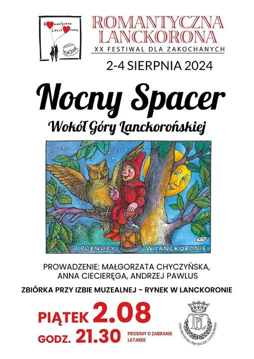 21.30 Spacer wokół Góry Lanckorońskiej Ania Ciecieręga, Gosia Chyczyńska i Andrzej Pawlus, zbiórka Izba Muzealna, prosimy o zabranie latarek.