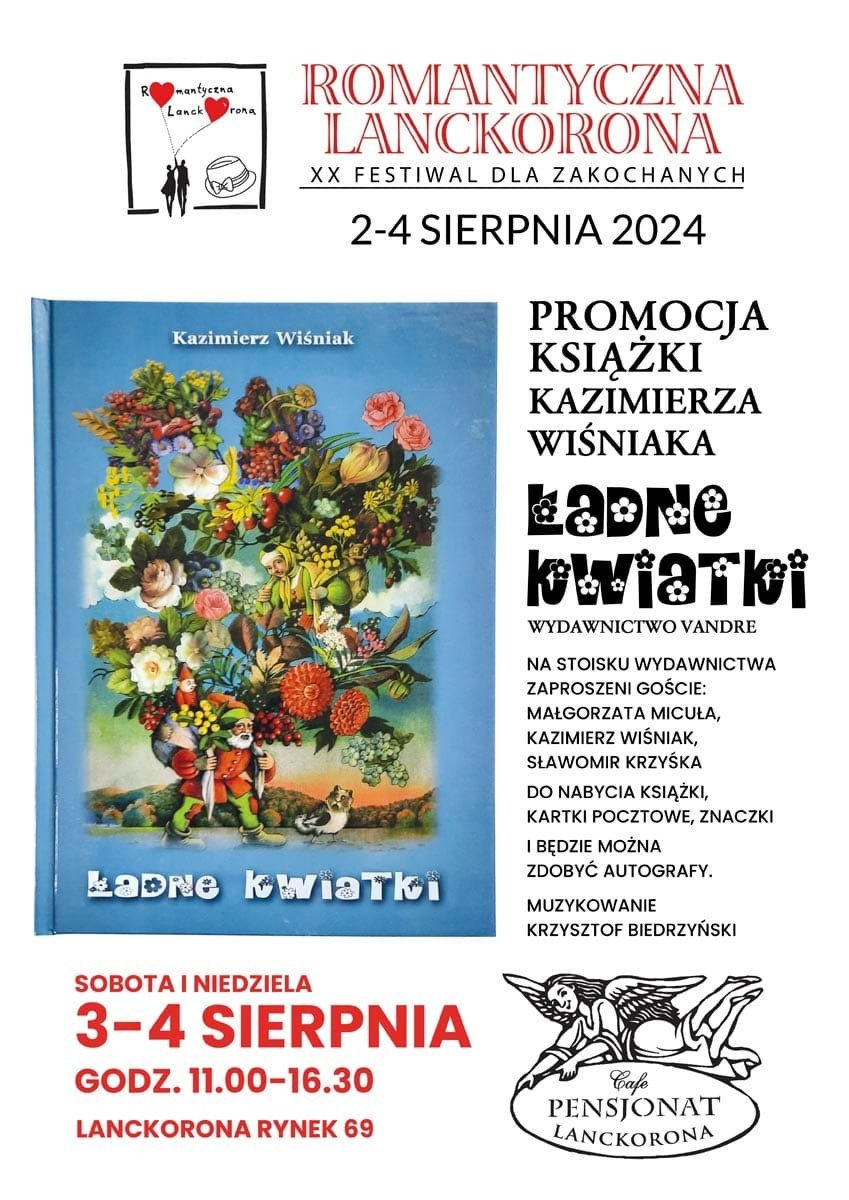 11.00 - 16.30 Wydawnictwo Vandre.pl promocja książki “Ładne kwiatki” Kazimierza Wiśniaka. Na stoisku wydawnictwa obecni będą Kazimierz Wiśniak, Małgorzata Micuła i Slawomir Krzyśka. Do nabycia książki, kartki pocztowe. Autografy / Cafe Pensjonat, Rynek 69