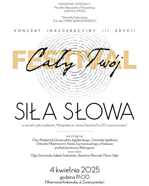 Muzeum Dom Rodzinny Ojca Świętego Jana Pawła II w 20. rocznicę odejścia Jana Pawła II do Domu Ojca zaprasza na koncert pt. „Siła słowa”. Koncert 4 kwietnia w Filharmonii im. Karola Szymanowskiego w Krakowie będzie jednocześnie inauguracją III edycji Festiwalu „Cały Twój”, który poświęcony jest dziedzictwu Papieża Polaka. Bezpłatne wejściówki dostępne są w kasach biletowych Muzeum oraz Filharmonii Krakowskiej od 14 marca br.