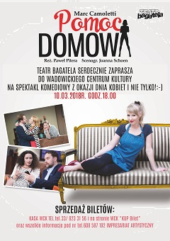 Już w najbliższa sobotę (10 marca) o godz. 18:00 w sali teatralnej WCK (ul. Teatralna 1) będzie można obejrzeć spektakl pt. "Pomoc domowa". Jest to kontynuacja brawurowego "Boeinga, boeinga – Odlotowych narzeczonych" w przezabawnym tłumaczeniu Bartosza Wierzbięty. Dla rezolutnej pokojówki Nadii nowa praca oznacza nowe kłopoty, choć entuzjastycznie oddający się romansom chlebodawcy pozwalają jej drenować swoje portfele i barek. W spektaklu publiczność odnajdzie wszystkie chwyty klasycznej farsy.