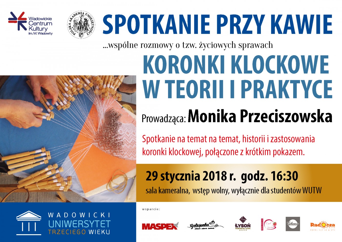 Koronka klockowa wraca do łask! Ta najdelikatniejsza i najbardziej szlachetna technika koronkarska przed laty zafascynowała Monikę Przeciszowską, która podczas styczniowego spotkania przy kawie opowie o historii koronki oraz narzędziach i materiałach niezbędnych do jej wykonania Podczas spotkania studenci WUTW będą mieli także okazję obejrzeć krótki pokaz oraz zapoznać się z technikami wyplatania koronki.