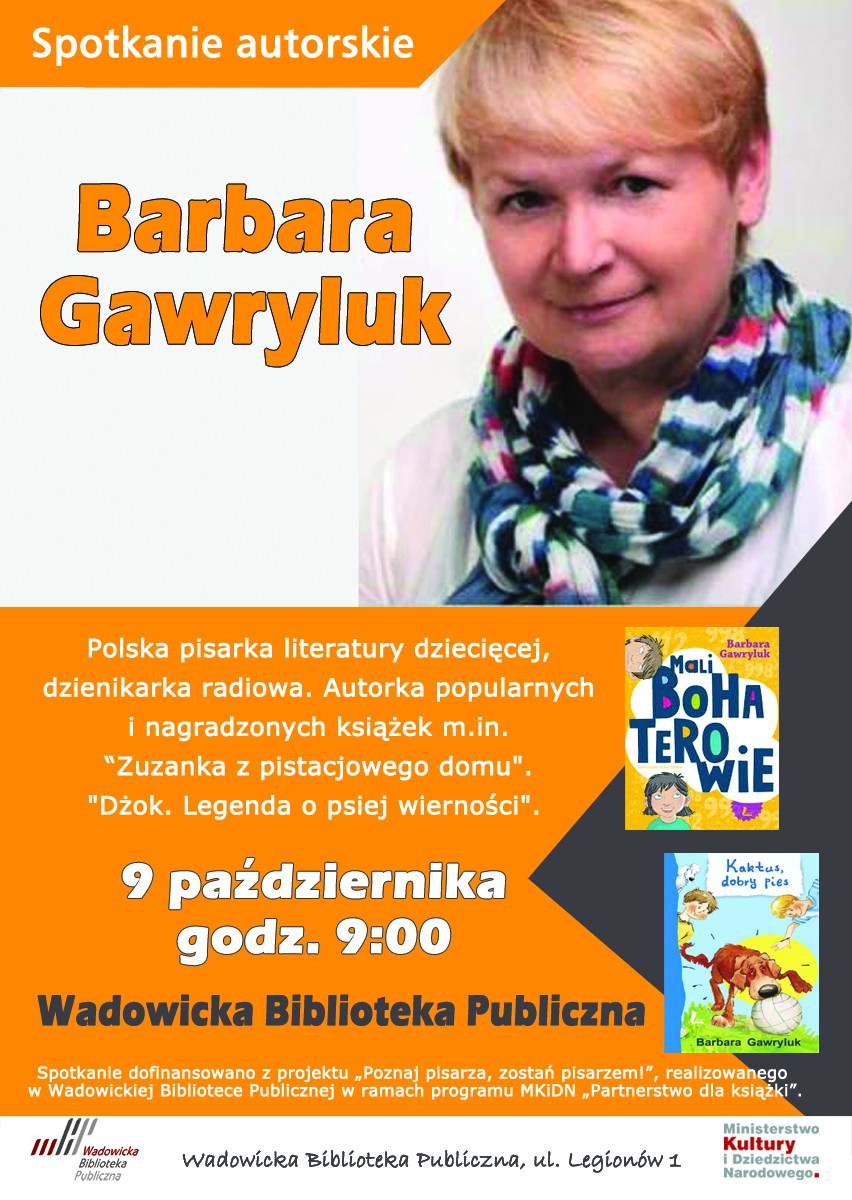 Wadowicka Biblioteka Publiczna (ul. Legionów 1) zaprasza dzieci z klas I-III szkół podstawowych na spotkanie autorskie z Barbarą Gawryluk, które odbędzie się 9 października o godz. 9.00.