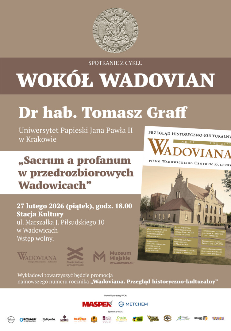 Stacja Kultury zaprasza na kolejne spotkanie z cyklu „Wokół Wadovian”. Gościem wydarzenia będzie dr hab. Tomasz Graff, profesor Uniwersytetu Papieskiego Jana Pawła II w Krakowie, który wygłosi wykład pt. „Sacrum a profanum w przedrozbiorowych Wadowicach”.