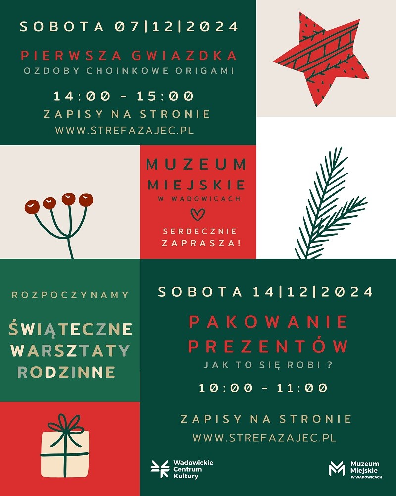 Muzeum Miejskie w Wadowicach zaprasza na świąteczne warsztaty dla rodzców z dziećmi w wieku szkolnym 7+. Zajęcia odbędą się 14 grudnia.