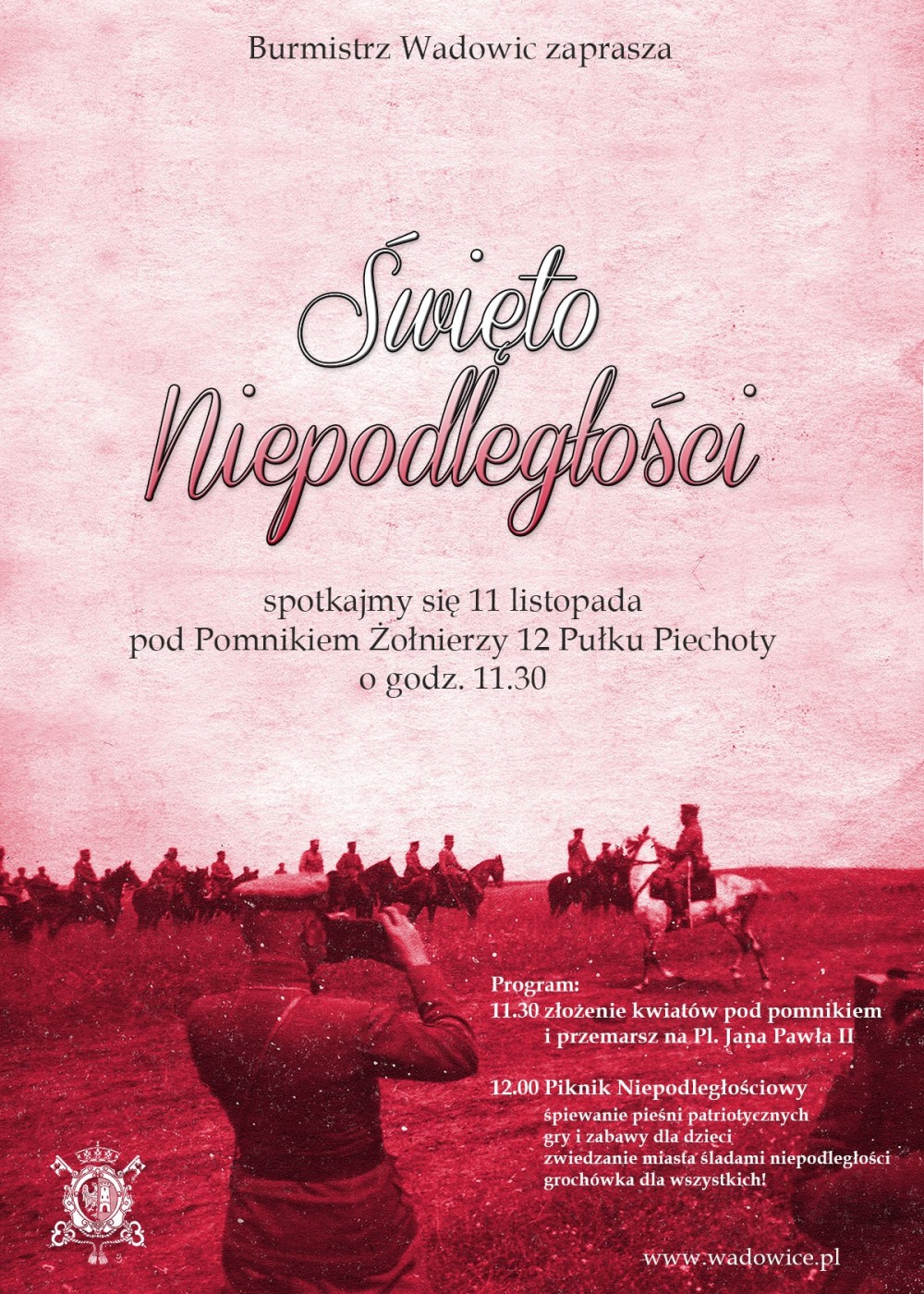 Burmistrz Wadowic zaprasza na obchody Święta Niepodległości, które rozpoczną się 11 listopada o godz. 11:30 pod Pomnikiem Żołnierzy 12 Pułku Piechoty. W programie: śpiewanie pieśni patriotycznych przy udziale członków Towarzystwa Miłośników Ziemi Wadowickiej, występ orkiestry dętej OSP z Kleczy oraz z Choczni, gry i zabawy dla dzieci, zwiedzanie miasta "Śladami Niepodległości" (początek o godz. 14:00 przed budynkiem Urzędu Miejskiego) i grochówka dla wszystkich!