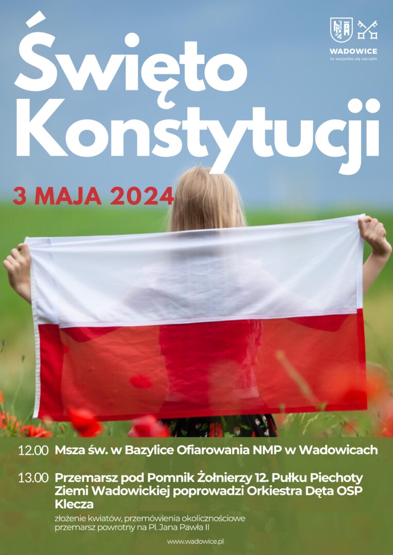 Z okazji 233. rocznicy uchwalenia Konstytucji 3 maja, będącej jednym z najważniejszych symboli niepodległości Polski, zapraszamy mieszkańców Gminy Wadowice do wzięcia udziału w oficjalnych uroczystościach poświęconych ustawie zasadniczej.